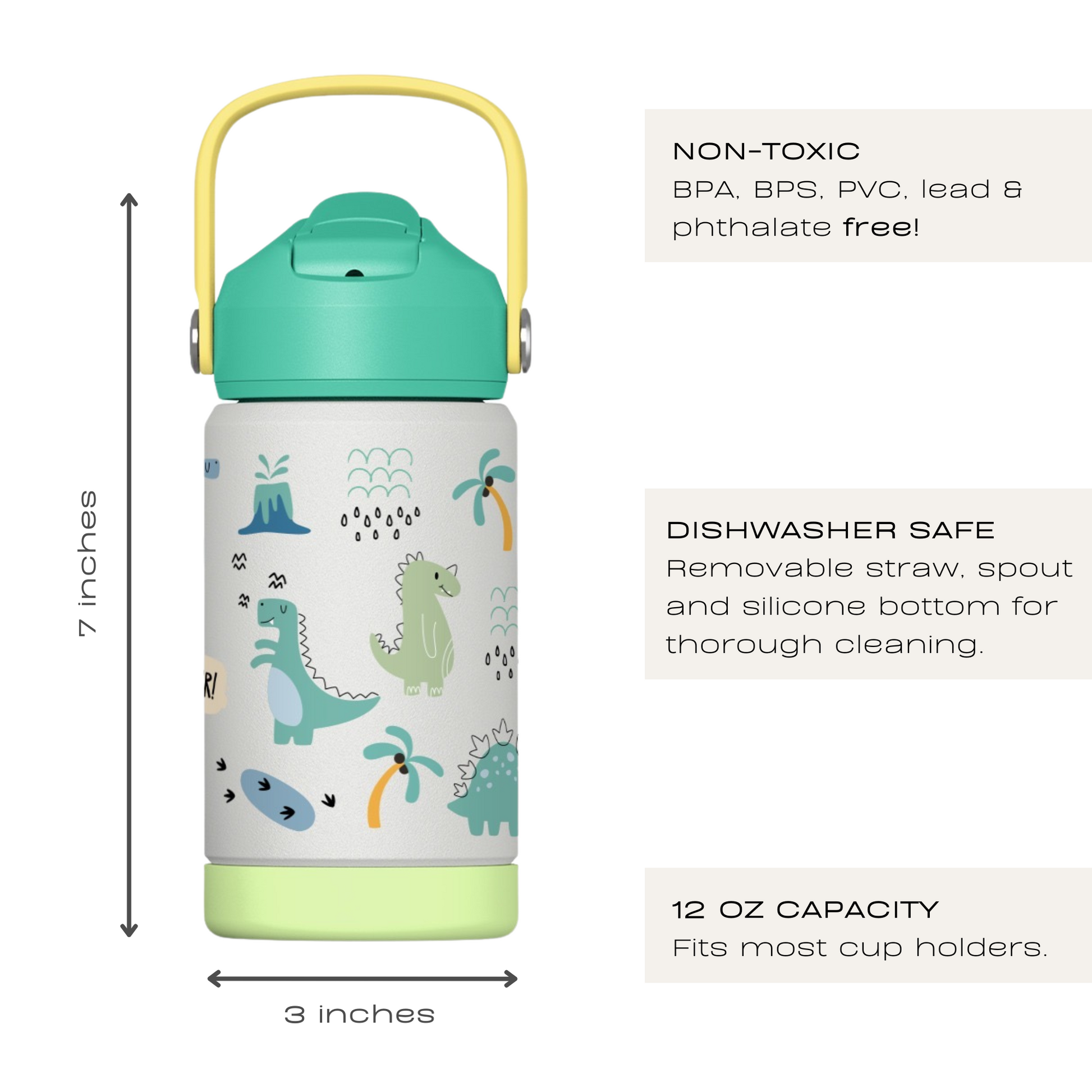 KID-FRIENDLY DESIGN: Includes a durable and removable non-slip silicone cover to protect the bottom from dents and scratches. Prolongs the life of your bottle and fits in most cup holders. The lid features a soft silicone handle for a comfortable grip that makes carrying a breeze! 12 oz capacity.