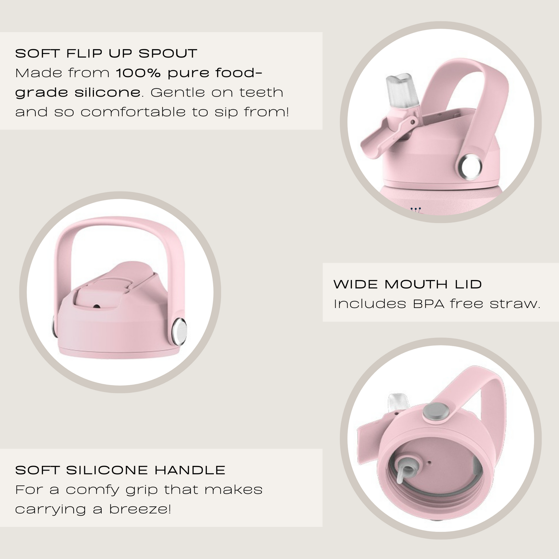 SOFT-TIP SPOUT: The wide-mouth lid includes a straw and a flip up soft spout made from food-grade silicone. It’s gentle on teeth and so comfortable to sip from!