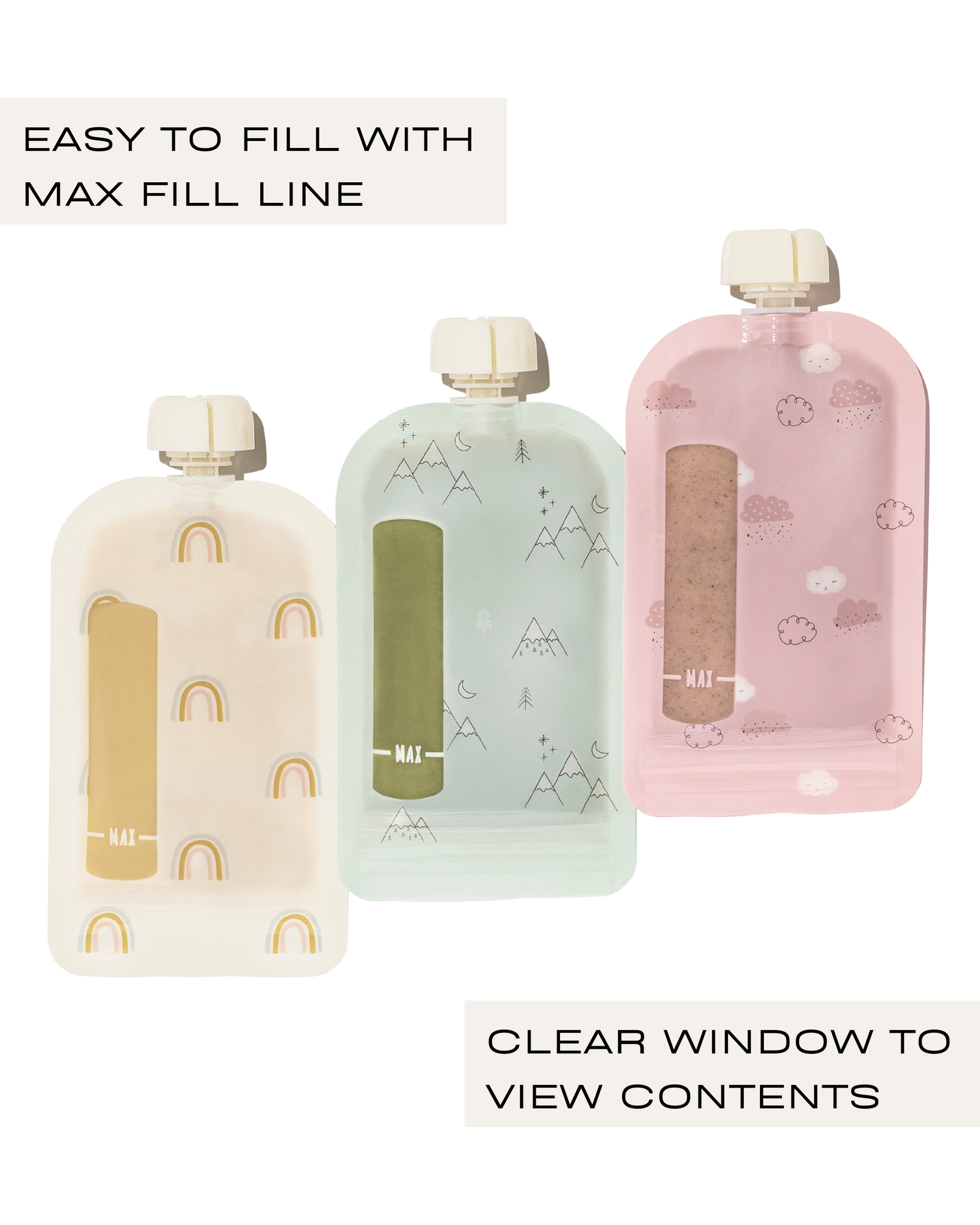 EASY TO FILL: Fill pouches with a spoon, measuring cup or blender through the zipper opening. The pouch features a clear window to easily view contents. Use the max fill line on the window as a guide to ensure your pouch does not overflow. Make sure to firmly seal all the way across the zipper, feeling it snap closed.