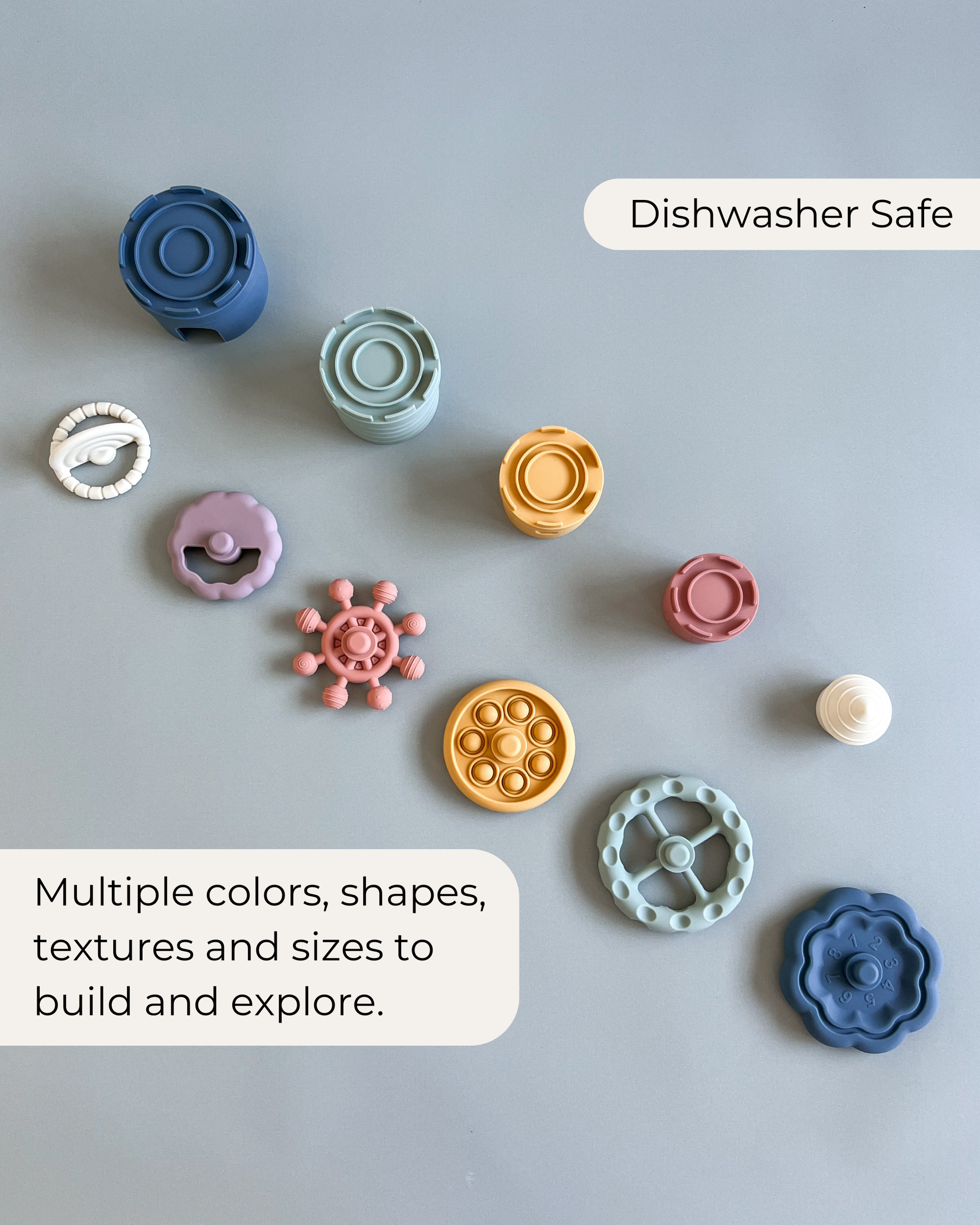 NON TOXIC FOOD-GRADE SILICONE: As one of the leading brands for silicone products for the past 7 years, quality has always been our first priority. Made from 100% pure food-grade silicone with NO added fillers, plastics or harmful chemicals, our silicone stacking toys are always free from BPA, BPS, PVC, lead & phthalates.