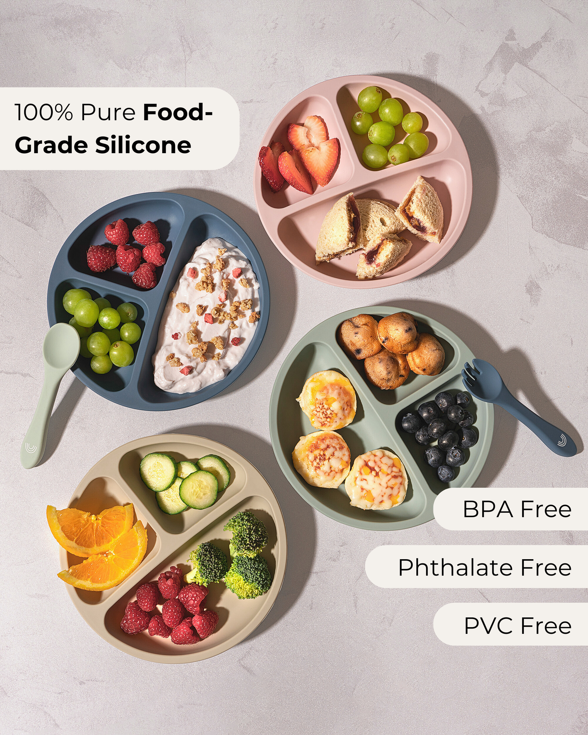 NON TOXIC FOOD-GRADE SILICONE: Made from 100% pure food-grade silicone with NO added fillers, plastics or harmful chemicals, our silicone plates are always free from BPA, BPS, PVC, lead & phthalates.