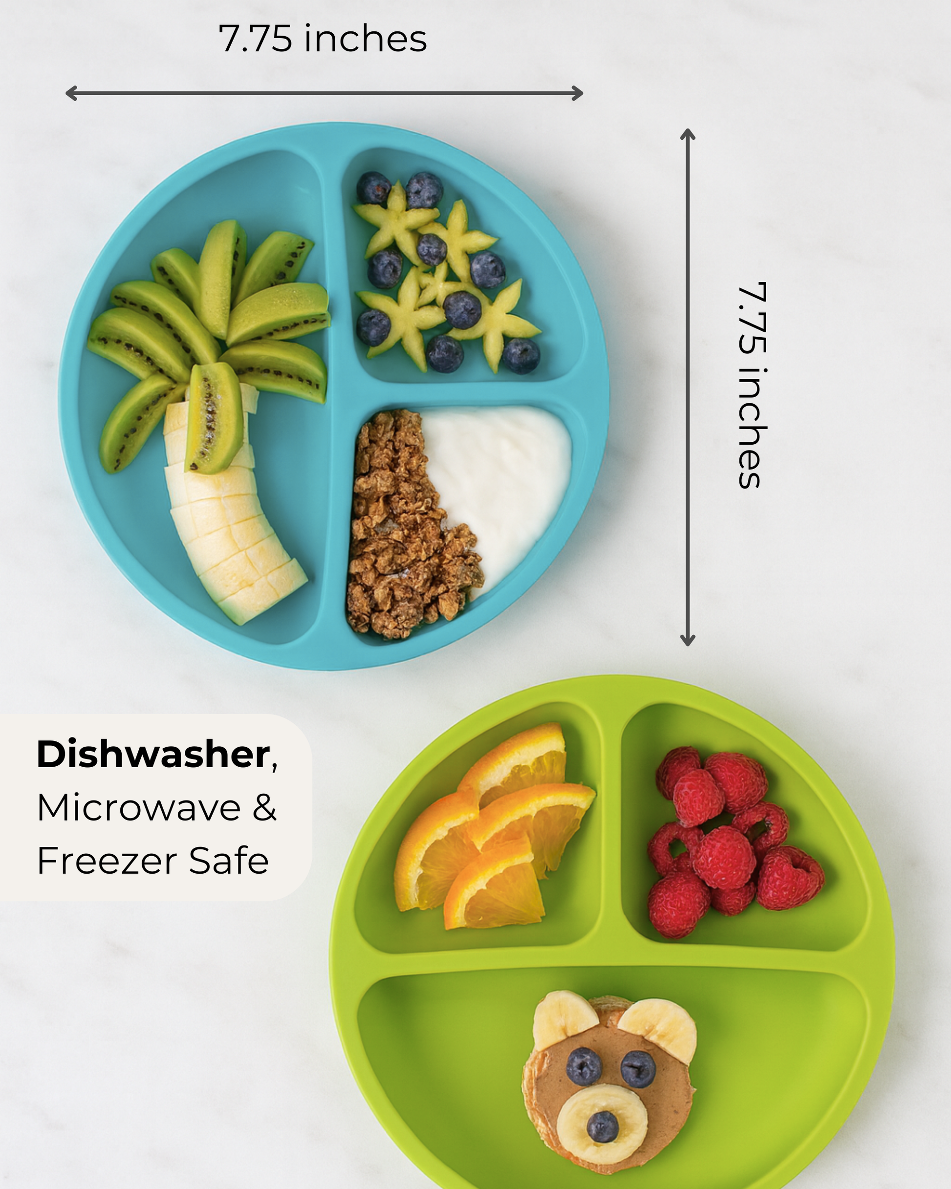 DISHWASHER, MICROWAVE & FREEZER SAFE: Our baby plates are easy to clean and dishwasher safe. Silicone can withstand high heat without warping or leaching into foods. Perfect for quickly reheating leftover plates! We recommend using mild detergent without fragrance for all silicone products. Stack and nest perfectly for easy storage in the kitchen or on the go! Measures 7.75 x 7.75 inches.
