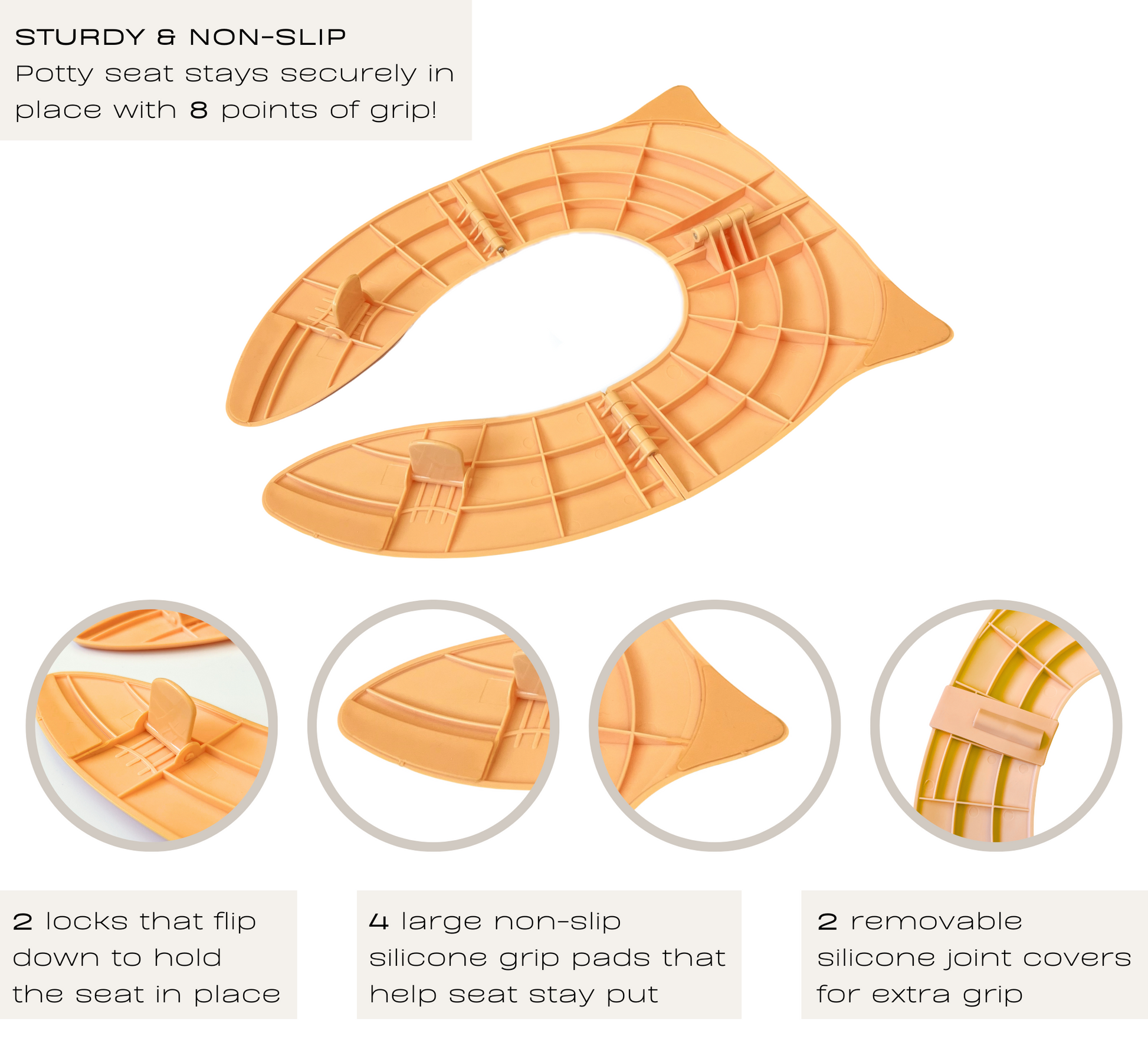 STURDY & NON-SLIP: The potty seat has 8 points of grip that help it stay securely in place. It includes 4 non-slip silicone grip pads under the ears and bottom ends and 2 locks that flip down to help the seat stay put and keep it from sliding. The 2 removable silicone joint covers also help to add more grip in the center of the seat, making it extra sturdy!